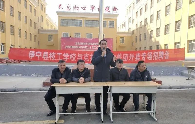 2月14日,伊宁县技工学校院内的小广场上热闹异常,原来这里正在举办克拉玛依市美团外卖专场招聘会。县人大常委会党组成员、副主任,县总工会主席马志强出席招聘会并给学员们做外出就业动员讲话。在县技工学校网约配送员培训班参训的学员现场与克拉玛依市美团外卖公司签订了劳动合同。克拉玛依市美团外卖业务负责人张磊告诉记者,前期伊宁县职业教育领导小组岗位开发招生就业组的工作人员就针对招工就业等相关情况与他们公司进行了对接,并根据公司需求组织了200名有就业意愿的劳动力进行网约配送员职业技能培训,此次又为他们举办了这个专场招聘会,给企业输送了一大批具备专业素质的员工。
