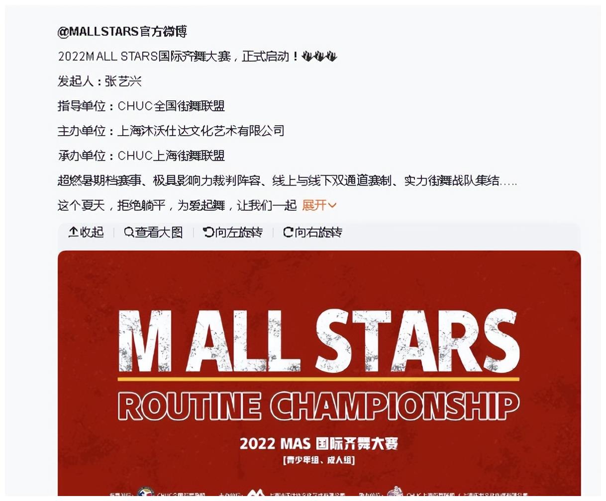这次由张艺兴作为发起人向国际的齐舞dancer们发出邀请,主题为2022 MAS 国际齐舞大赛。这次的活动是由 上海沐沃仕达文化艺术有限公司 主办的
