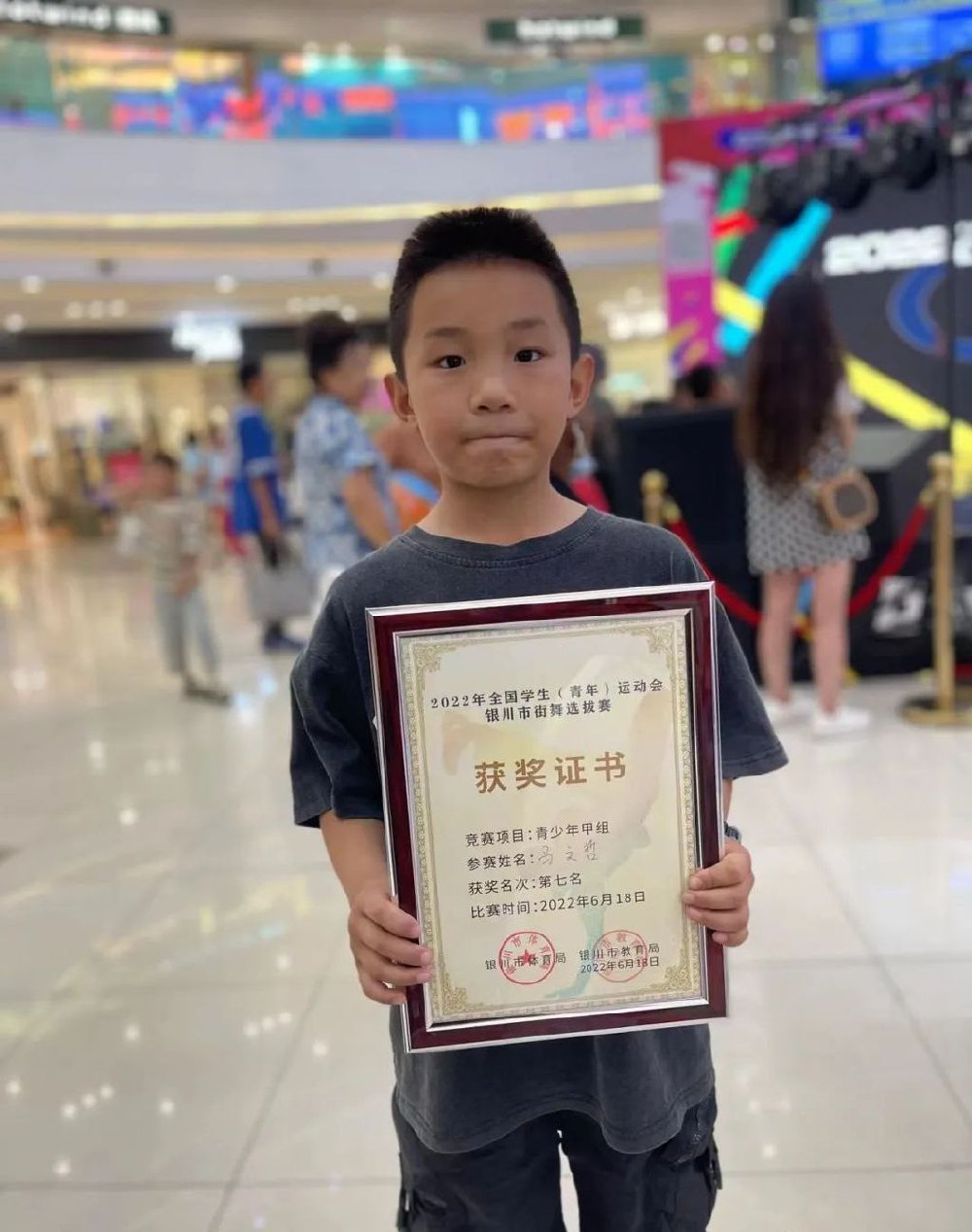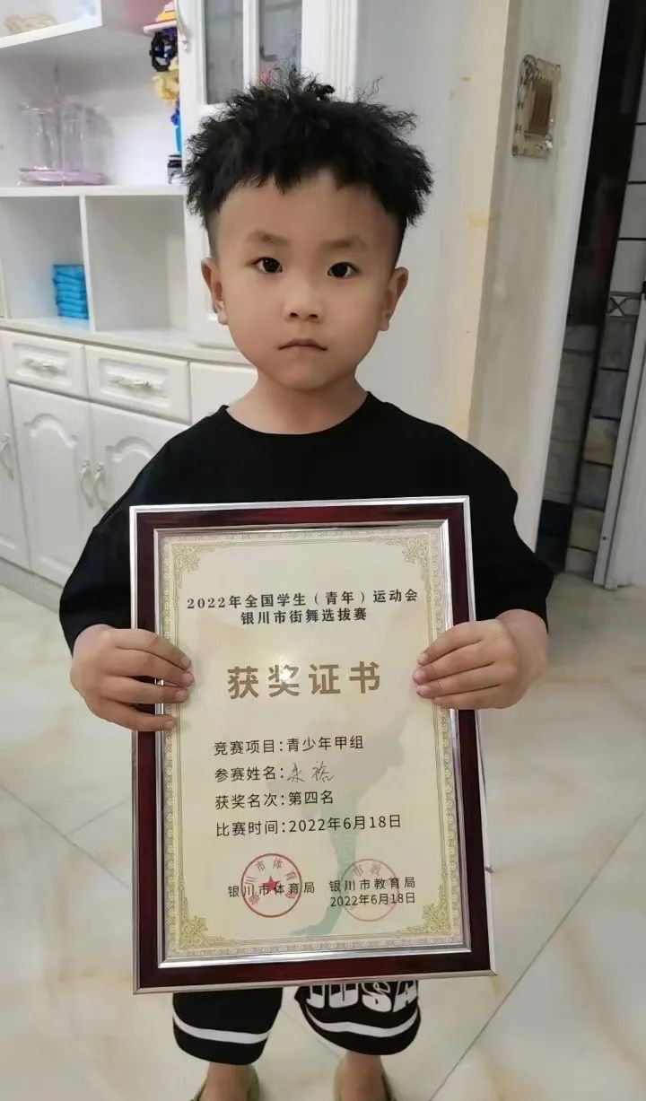6月18日,2022全国学生(青年)运动会银川市街舞选拔赛开赛,来自全区各地的约200名青少年街舞选手报名参赛。本次比赛由银川市体育局、银川市教育局主办,宁夏健美运动协会街舞专项委员会承办 。比赛分为霹雳舞青少年甲组(6-9岁)青少年乙组(6-12岁)青少年丙组(13-16岁)三个组别。其中,来自中卫舞鸣街舞俱乐部的朱裕、马文哲两位小朋友分获青少年甲组的第四名和第七名。朱裕(6岁)——中卫市舞鸣街舞俱乐部